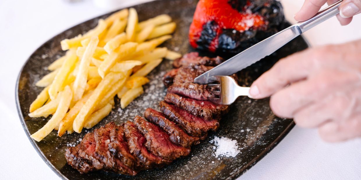 Solomillo en cortes finos, con pimiento asado y papas fritas
